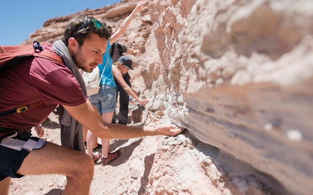 Durch Klicken der Pfeile oder ins Foto kannst du zwischen unterschiedlichen Ansichten der in der Cordillera de la Sal vorkommenden Gesteine wechseln.