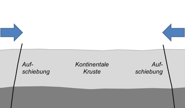 Diese Grafik zeigt ein hypothetisches West-Ost-Profil durch die kontinentale südamerikanische Krustenplatte im Bereich des heutigen Salar de Atacama zu Beginn der Andenhebung. Durch die Subduktion der Nazca-Platte unter die südamerikanische Platte kam es zur Kompression, und damit zur Bildung von Störungen oder Störungszonen in der Südamerikanischen Platte. An diesen Störungen begann dann die Aufschiebung der angrenzenden Plattenelemente.