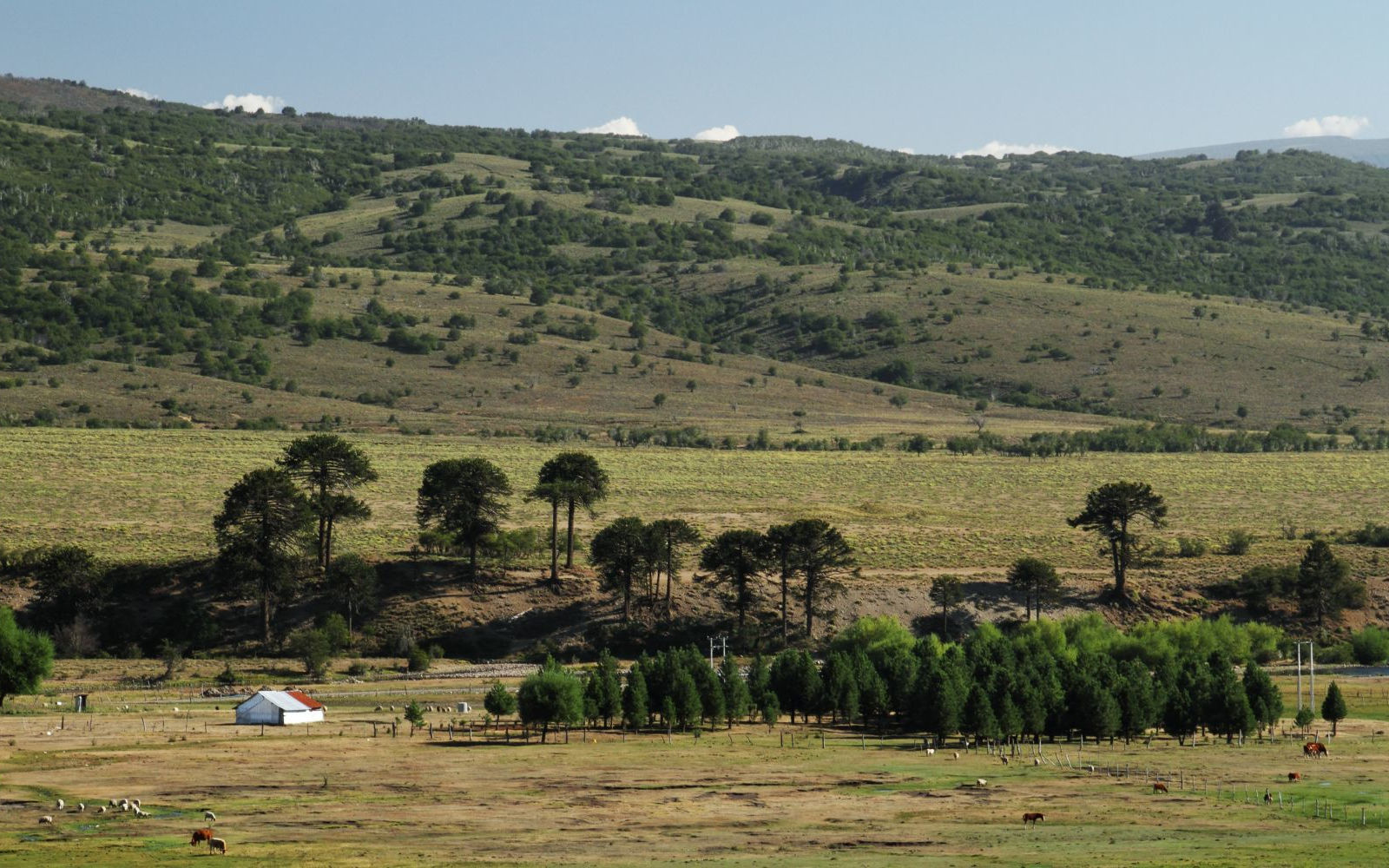 Typische Landschaft zwischen Liucura und Icalma: während der Talboden vor allem viehwirtschaftlich genutzt wird, sind die Hänge von teilweise lockeren Beständen aus laubwerfenden Südbuchen und Araukarien bedeckt.