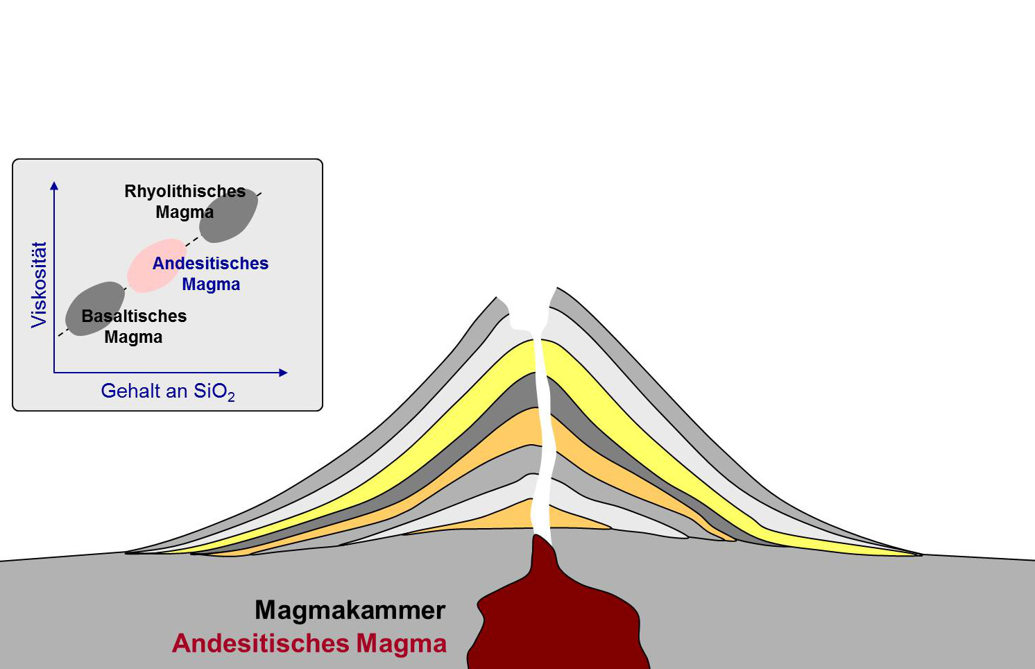 Wenn eine ozeanische Krustenplatte steil unter eine andere - ozeanische oder kontinentale - Platte abtaucht, kommt es häufig zum Aufschmelzen von Bereichen des oberen Erdmantels. Das dadurch entstehende Magma steigt auf und tritt in Form von Lava oder vulkanischem Lockermaterial mehr oder weniger explosiv zu Tage. Die Gesteinsschmelze ist meist recht zähflüssig, weshalb die unterschiedlichen Schichten steile Hänge bilden können. So entstehen Schichtvulkane, auch Stratovulkane genannt. Durch das Abtauchen der Nazca-Platte unter die Südamerikanische Platte entlang fast der gesamten Anden sind Schichtvulkane hier sehr häufig. Viele von ihnen sind erloschen oder ruhend, während sich andere immer wieder bemerkbar machen und die Gesellschaft vor Herausforderungen stellen.